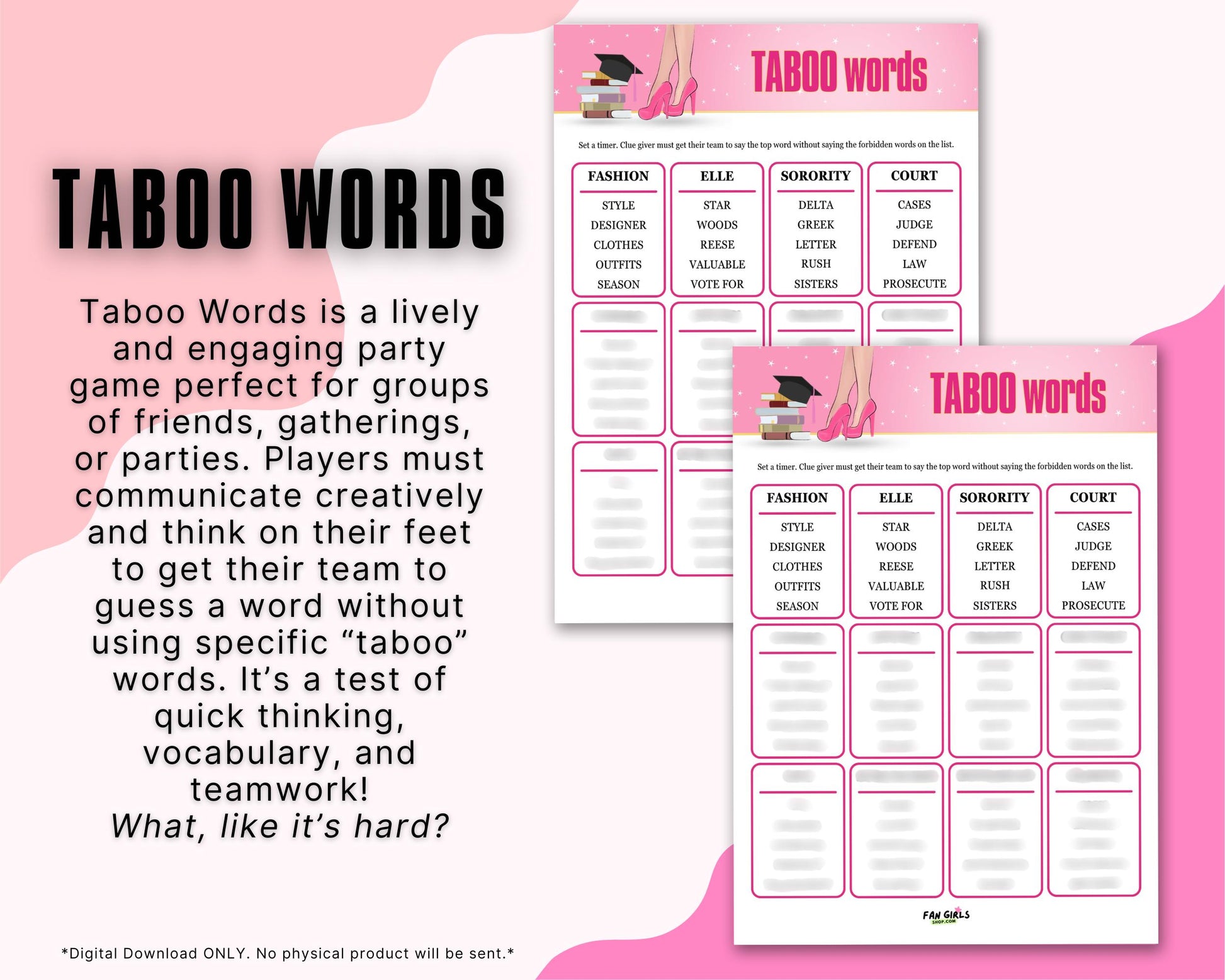 Legally Blonde inspired digital download printable Taboo Words party game!